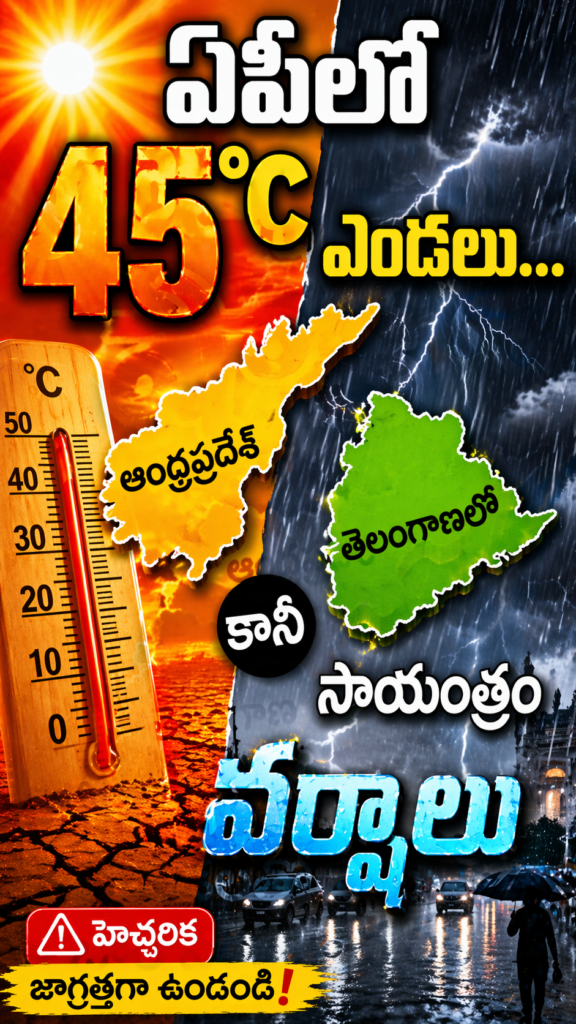నేడు, ఏప్రిల్ 24, 2026న తెలుగు రాష్ట్రాల్లో భిన్నమైన వాతావరణ పరిస్థితులు కనిపిస్తున్నాయి. ఆంధ్రప్రదేశ్లో తీవ్రమైన ఎండలు, వడగాల్పులు కొనసాగుతుండగా, తెలంగాణలో ఎండలతో పాటు కొన్ని ప్రాంతాల్లో సాయంత్రం అకాల వర్షాలు కురిసే అవకాశం ఉంది.
