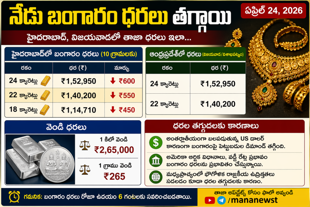 నేడు ఏప్రిల్ 24, 2026 తెలుగు రాష్ట్రాల్లో బంగారం ధరలు స్వల్పంగా తగ్గుముఖం పట్టాయి. గత కొన్ని రోజులుగా అంతర్జాతీయ మార్కెట్లో హెచ్చుతగ్గులు, అమెరికన్ డాలర్ బలపడటం, పెట్టుబడిదారుల ధోరణి మారడం వల్ల బంగారం రేట్లు తగ్గుతున్నాయి. పెళ్లిళ్లు, శుభకార్యాలు, పెట్టుబడుల కోసం బంగారం కొనాలని చూస్తున్న వారికి ఇది కొంత ఊరటనిచ్చే వార్తగా మారింది.