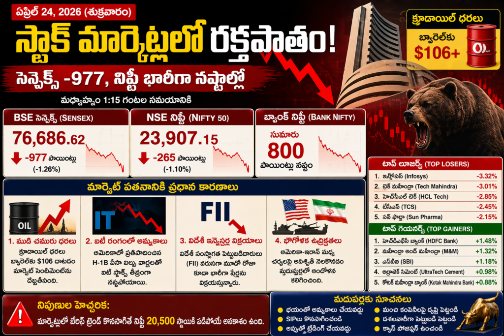 నేడు ఏప్రిల్ 24, 2026 (శుక్రవారం) భారత స్టాక్ మార్కెట్లు భారీ ఒత్తిడిలో ట్రేడవుతున్నాయి. అంతర్జాతీయంగా పెరుగుతున్న ముడి చమురు ధరలు, ఐటీ షేర్లలో అమ్మకాల ఒత్తిడి, విదేశీ ఇన్వెస్టర్ల విక్రయాలు, అమెరికా-ఇరాన్ ఉద్రిక్తతలు—all కలిసి మార్కెట్లను తీవ్రంగా దెబ్బతీశాయి.